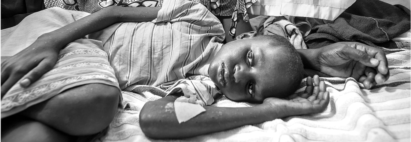 A malnourished child in a diarrhea ward in Africa — one of 550 children who die every day from Cryptosporidiosis., while millions more suffer lifelong impairment.