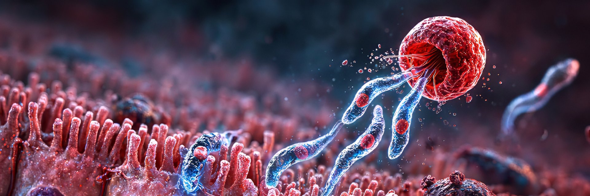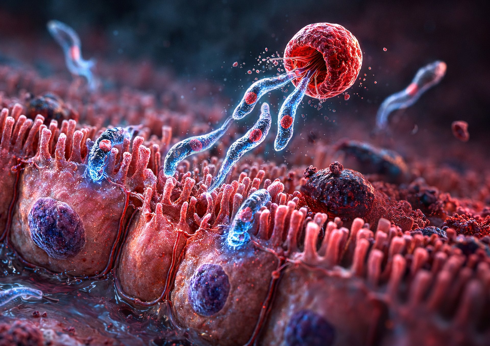 Disclaimer: AI-generated scientific illustration based on Cryptosporidium biology, created to visualize a microscopic process that is hard to capture. © 2026 Neglected Parasite Initiative. All rights reserved.